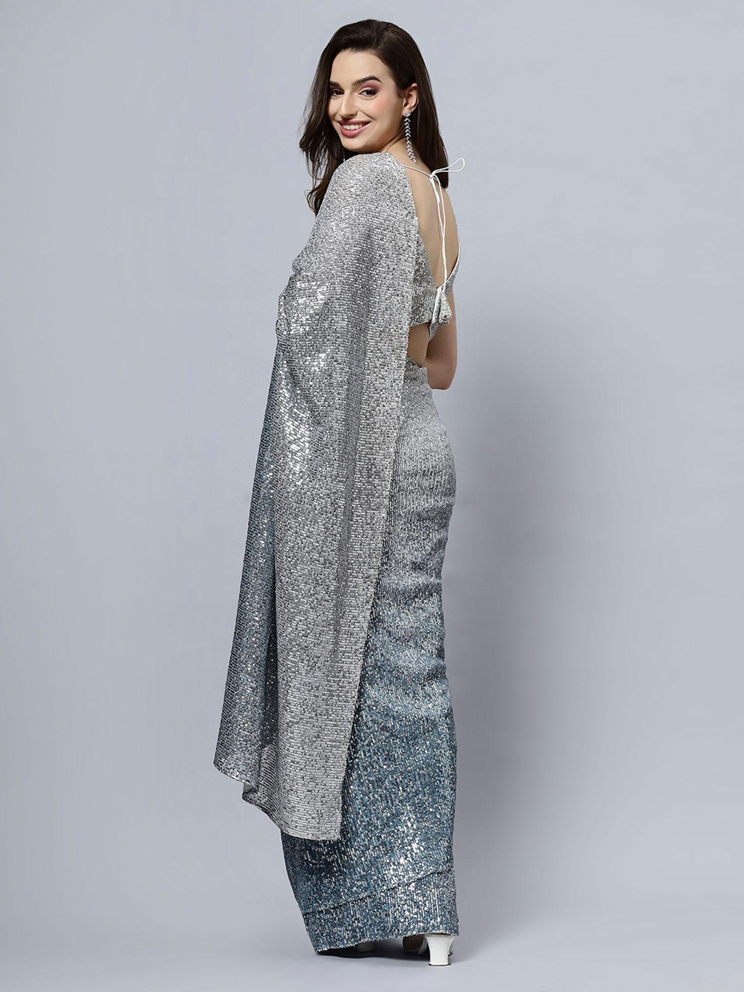 Madelyn Luxe Steel Ombre Sequin Pre Draped Saree with Unstitched Blouse