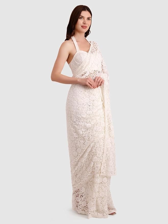 Women’s Cotton Crochet Off-White Saree Without Blouse – Stunning Net Fix Embellishments, Indian Ethnic Wear for Women, Traditional Saree for Parties, Weddings, and Festivals
